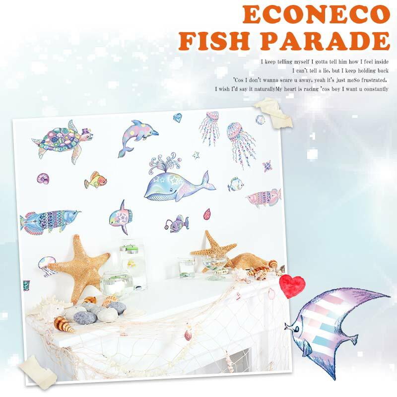 話題のイラストレーター 絵子猫 の描く世界がウォールステッカーに ウォールステッカー メール便 送料無料 エコネコフィッシュパレード サイズ 8枚組 飾り 飾り付け Econeco 絶品 海 クジラ トイレ 魚 水族館 お風呂 エコネコ 子供部屋 キッズルーム シール式 イルカ